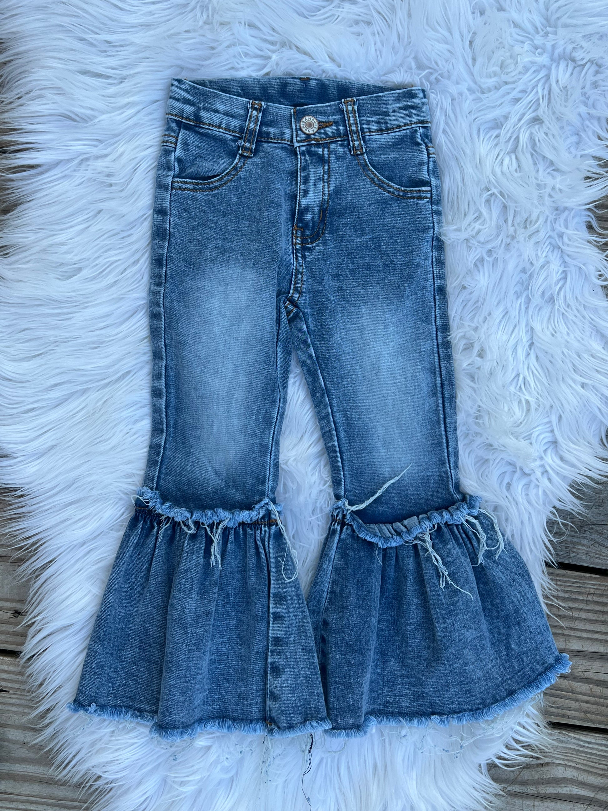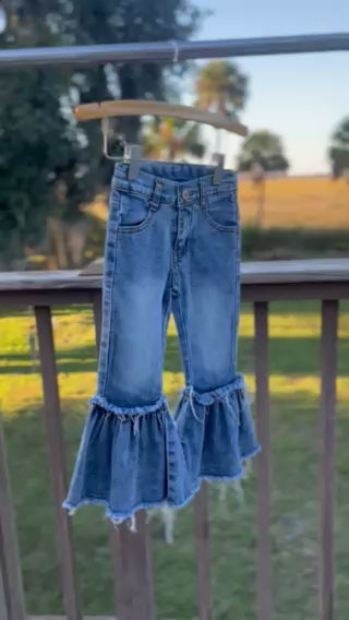 Our quality ruffle jeans are the perfect statement and they fit amazing and feel spectacular. All our jeans have adjustable waists. She will love her look and they pair great with all our accessories Belt and bow sold on our website