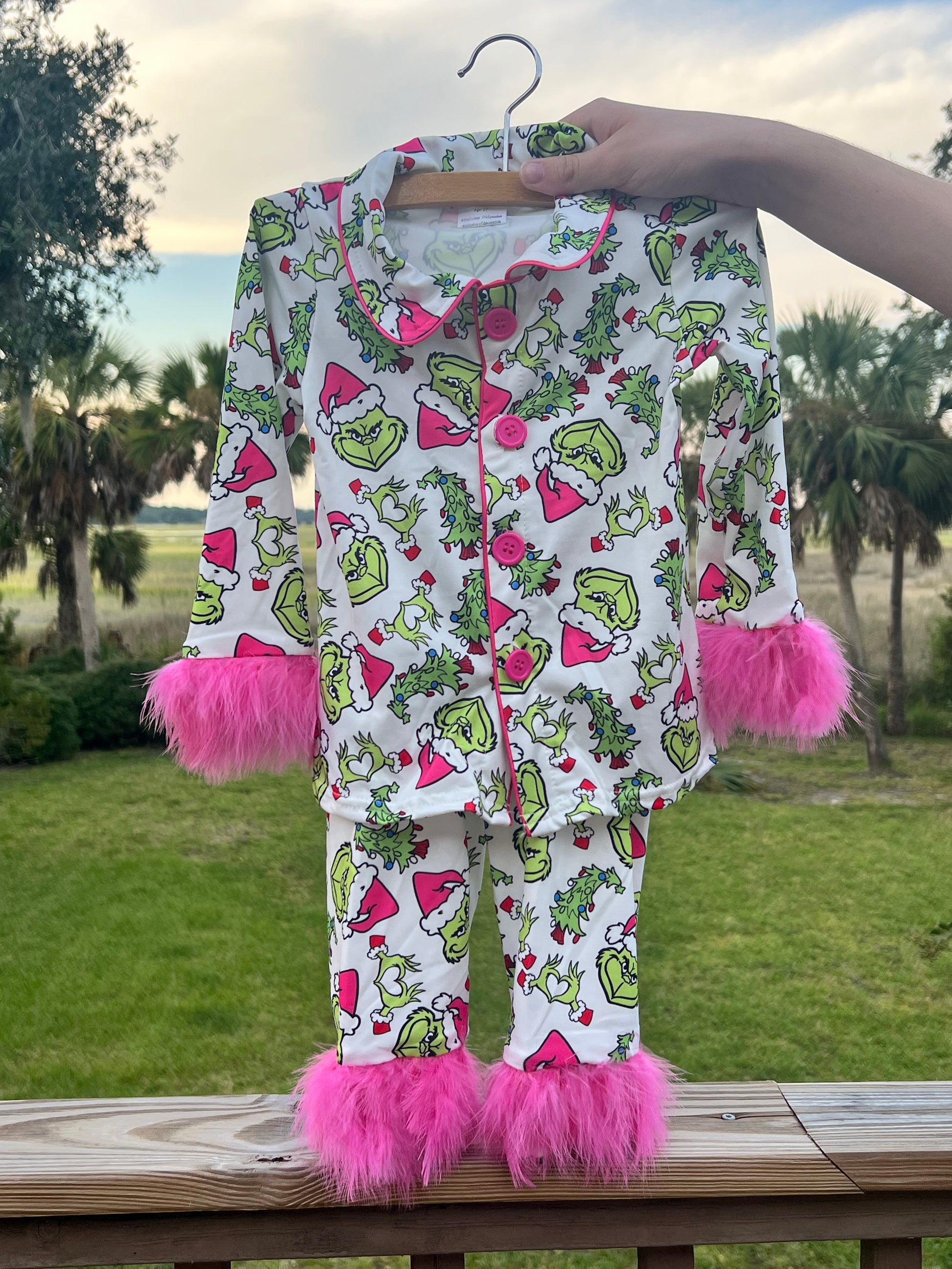 Holiday perfection with fur trimmed arms and legs. Perfect Christmas morning outfit or that one to wear to school on PJ day. Or just because she wants to fill special. Want a perfect photo op outfit? Mom sets are coming soon so you can match in those photos