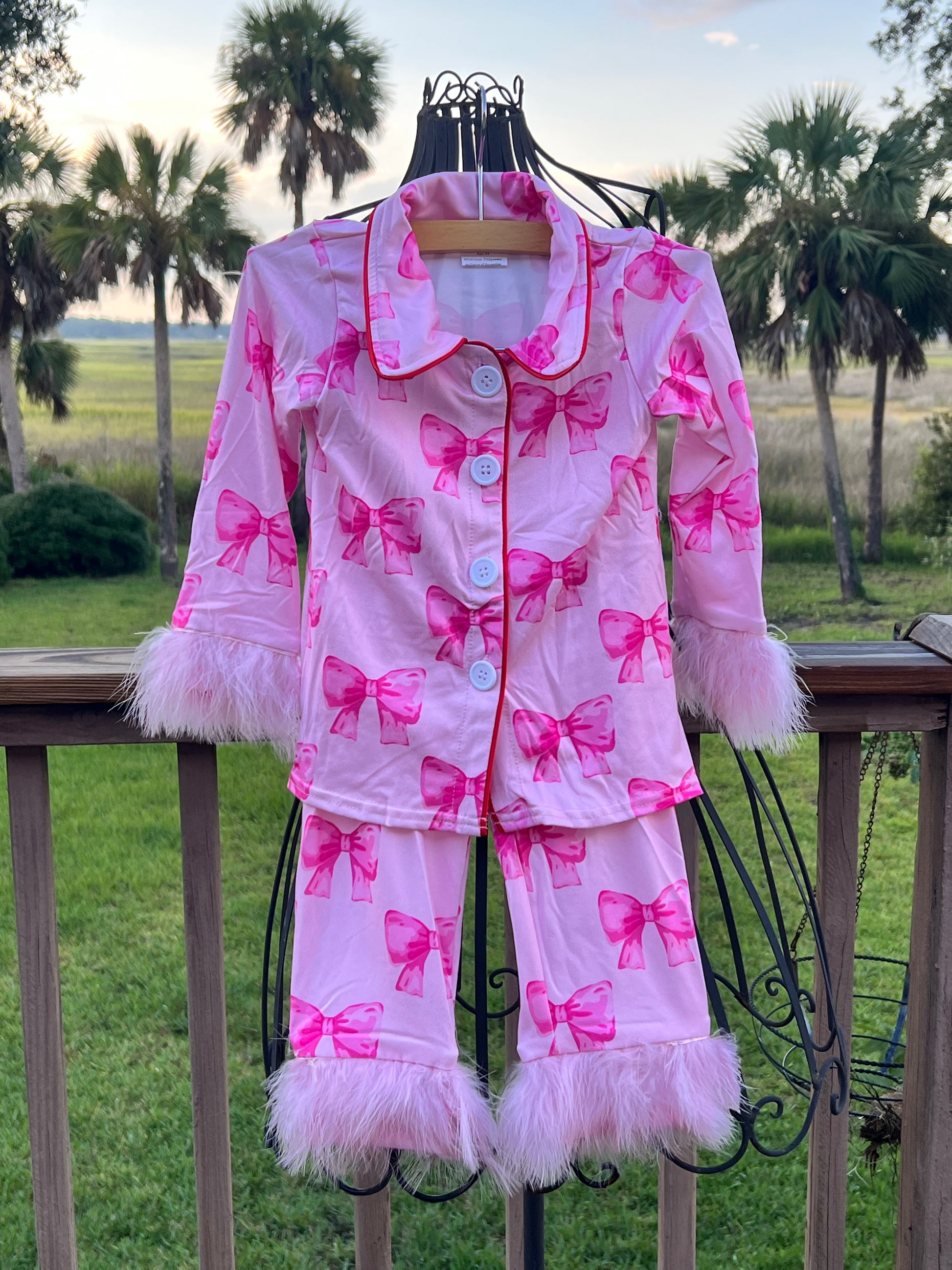 Pink Bow with fur trimmed arms and legs. Perfect Christmas morning outfit or that one to wear to school on PJ day. Or just because she wants to fill special. Want a perfect photo op outfit? Mom sets are coming soon so you can match in those photos